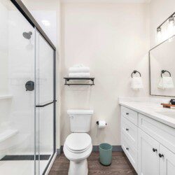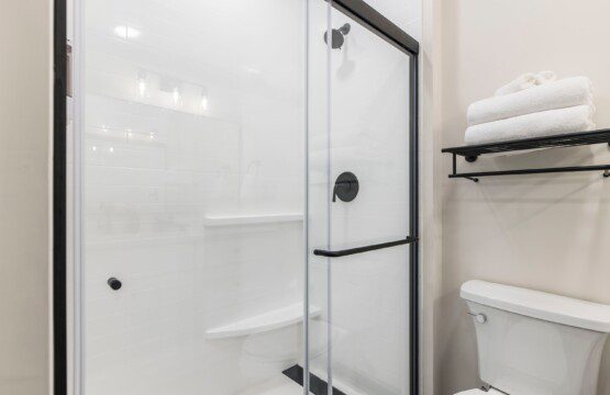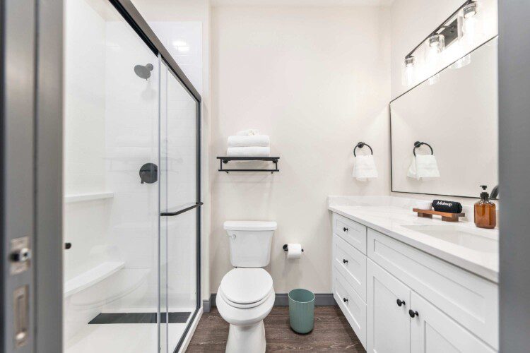 Private bathroom with shower, fresh towels, and toiletries