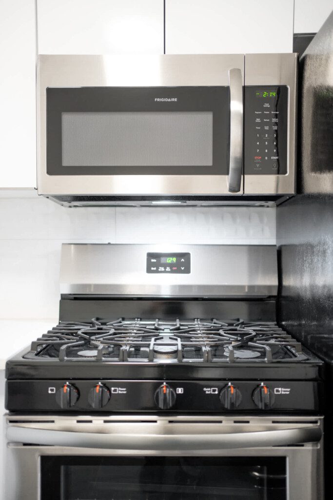 Kitchen: Brand-new stainless steel appliances, quartz countertops, tile backsplash, cookware, and utensils