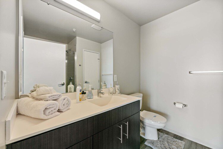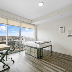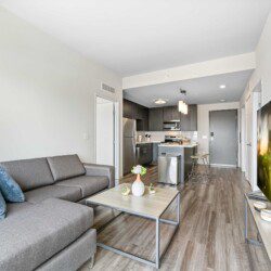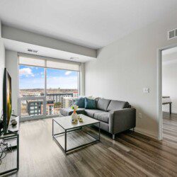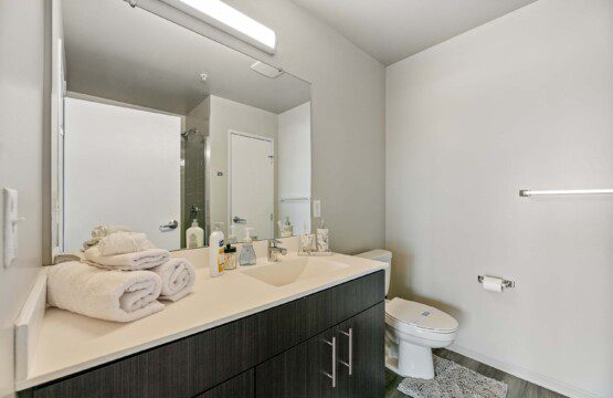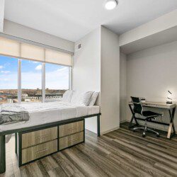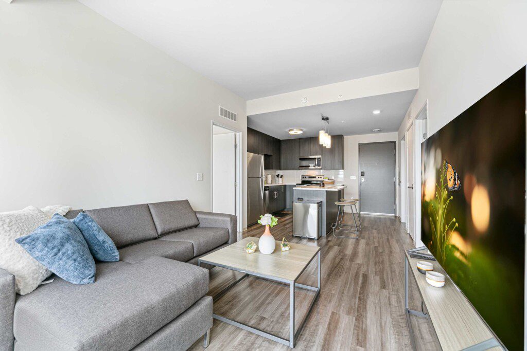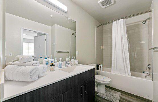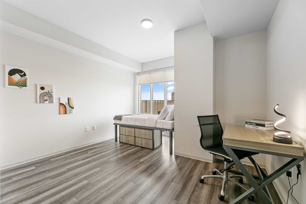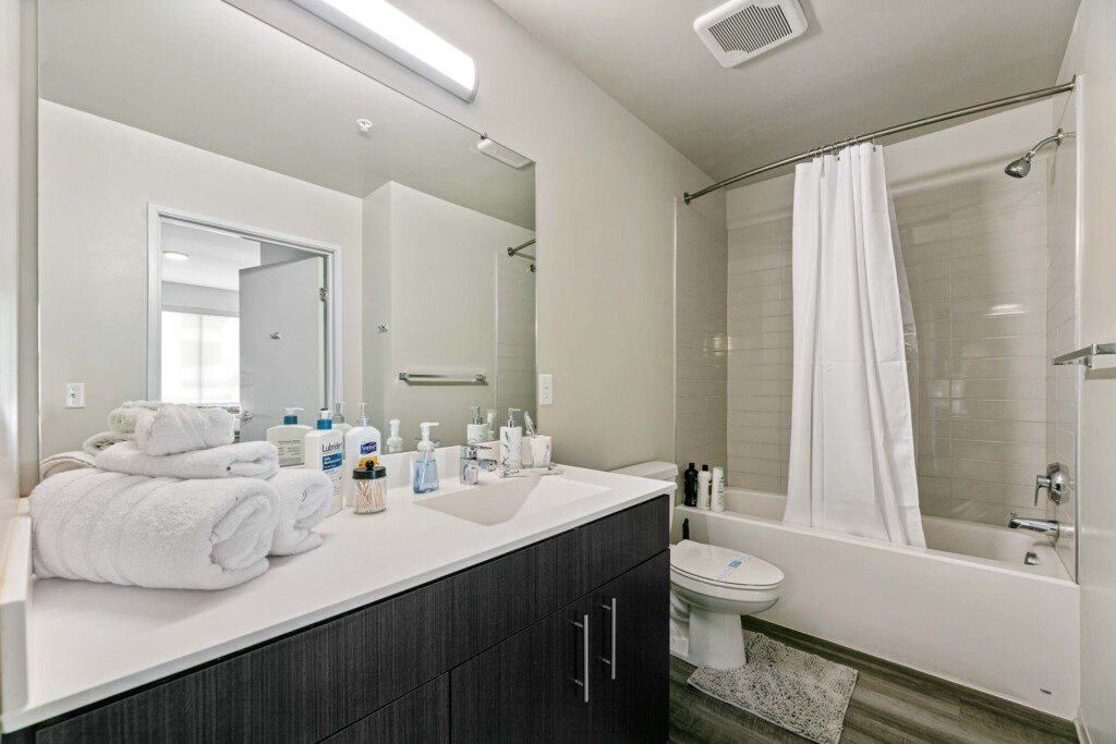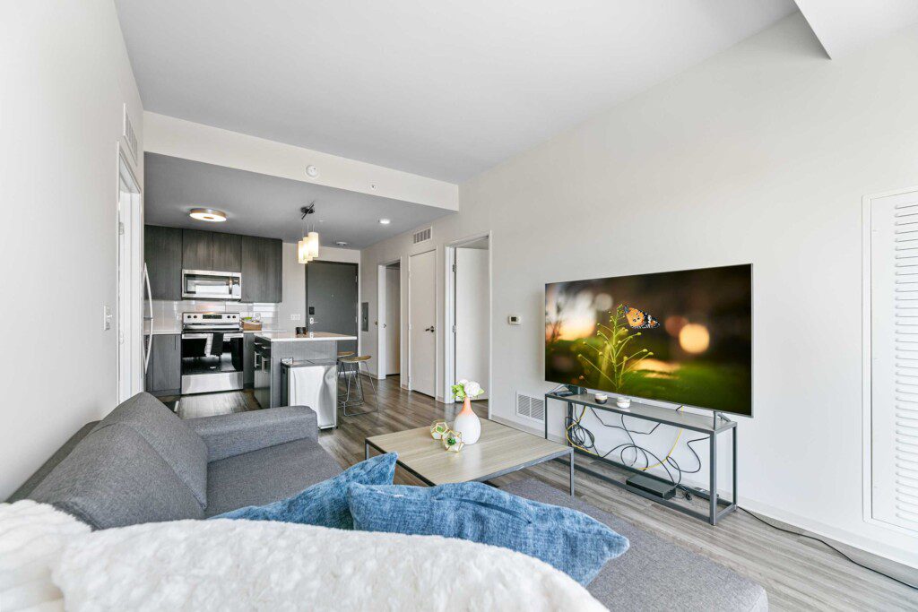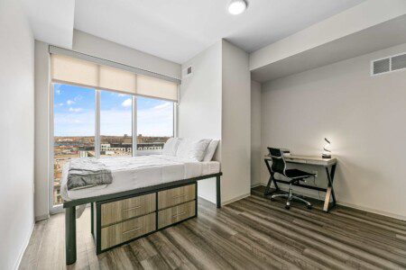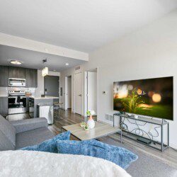 Each bedroom includes a full-size bed, private bathroom, and dedicated workspace, making it easy to relax or stay productive. The open-concept kitchen flows into a cozy living area with a smart TV and floor-to-ceiling windows offering expansive views of the city skyline.