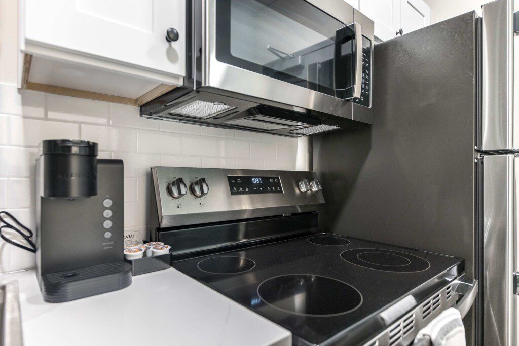– Full kitchen with refrigerator, microwave, coffee maker, cookware, and essentials (This room does not have a stove/oven)