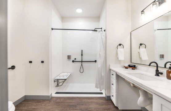 – Private bathroom with roll-in shower, shower bench, grab bars, towels, and toiletries