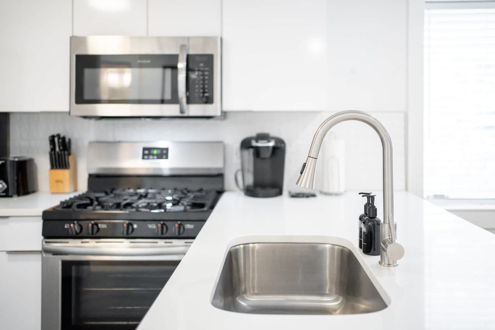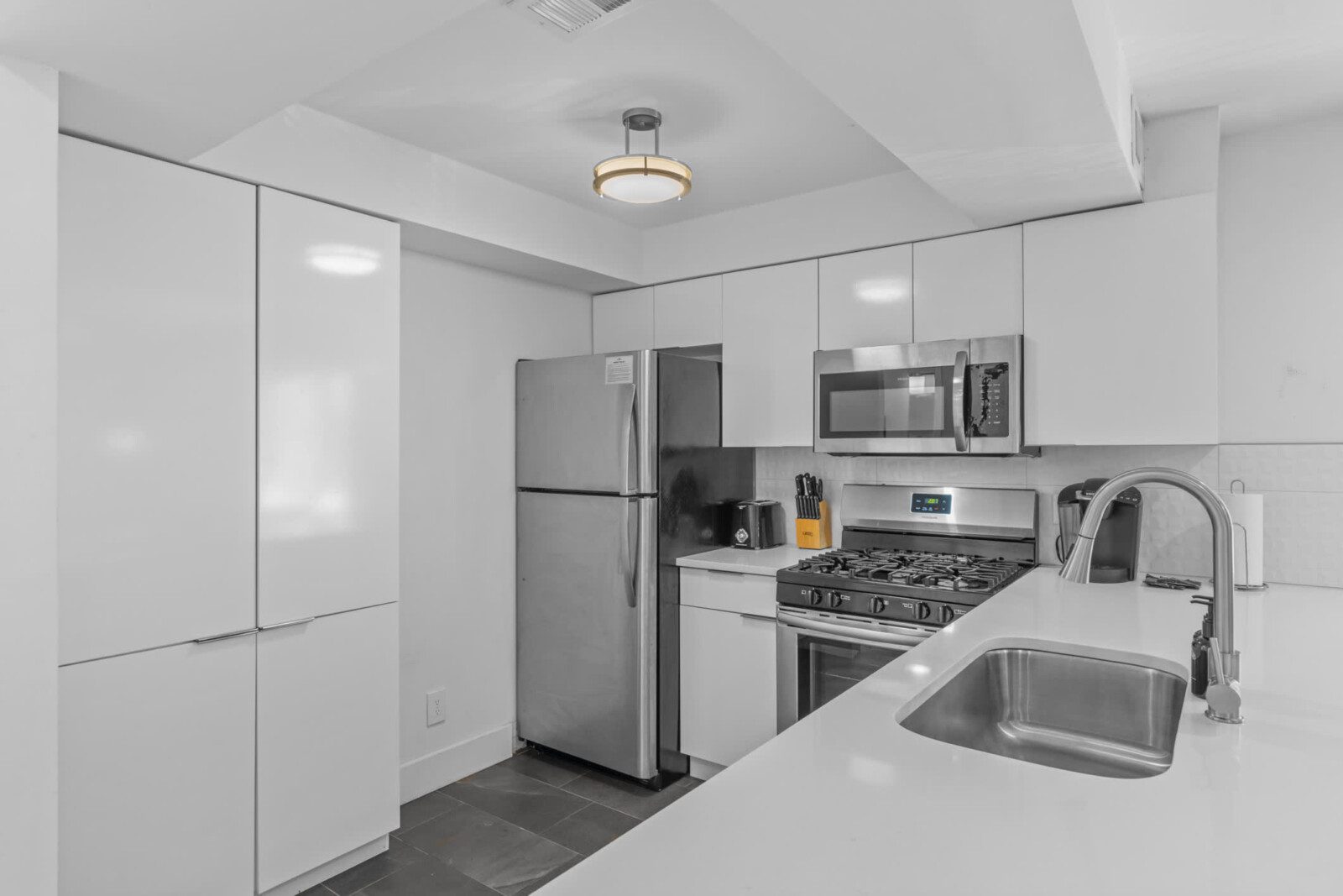 Kitchen: Brand-new stainless steel appliances, quartz countertops, tile backsplash, cookware, and utensils