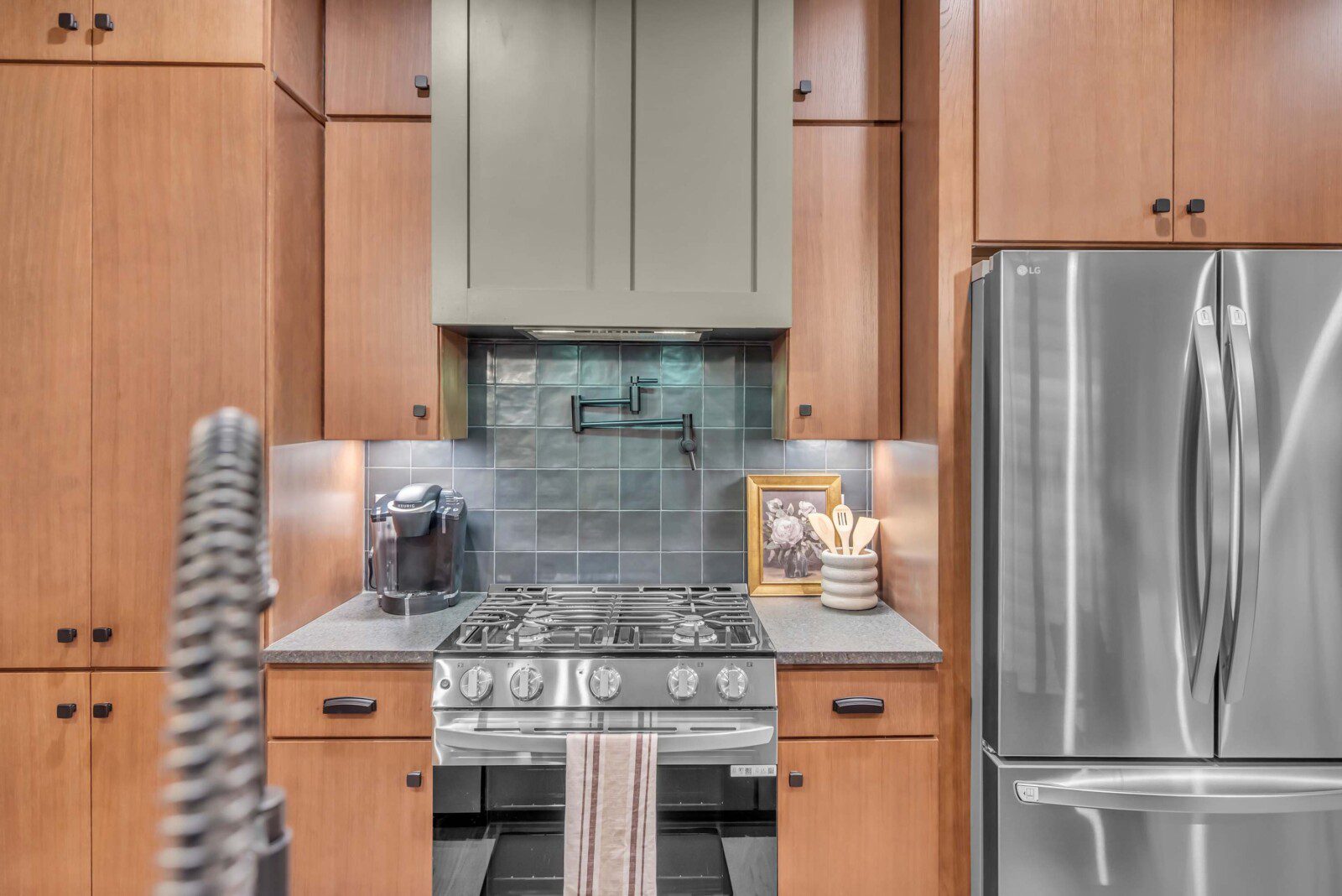 • Open-concept kitchen with stainless-steel appliances, island seating & Keurig