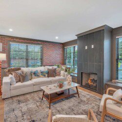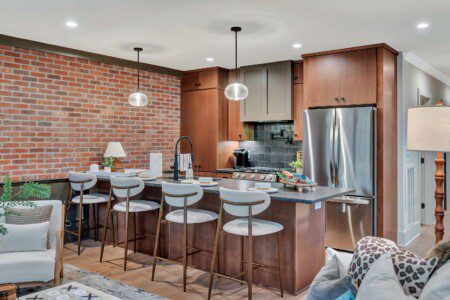 Gather in the open-concept living room with exposed brick walls, cozy seating, and modern décor — or take the evening to the rooftop deck for fresh air and skyline views.