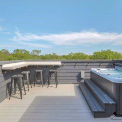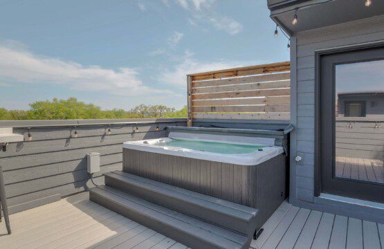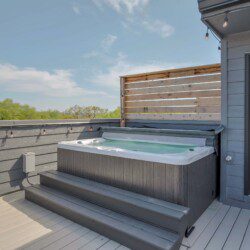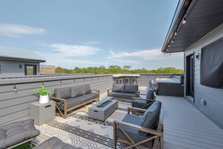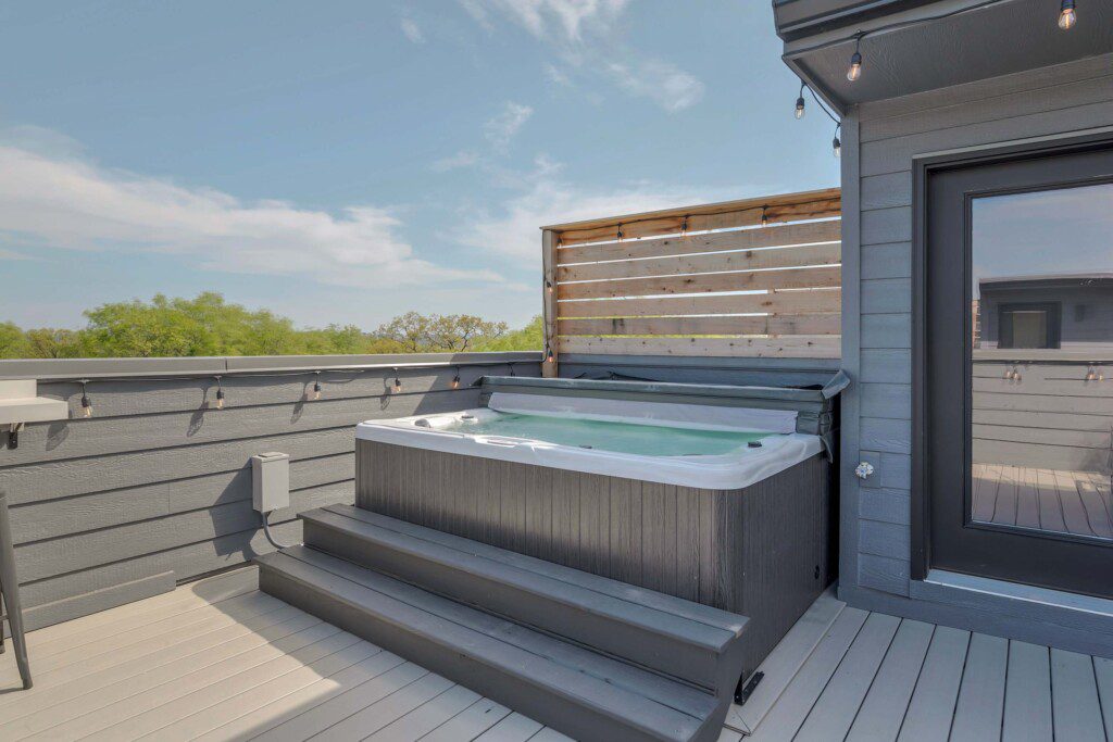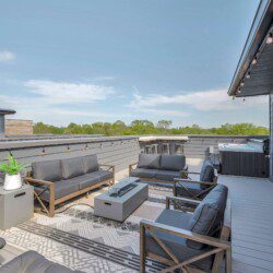 – Expansive rooftop lounge with hot tub, fire pit, TV, and string lights