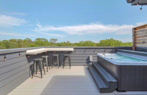 – 2 Rooftop Lounges with hot tubs, fire pits, TV/projector setup, and string lighting