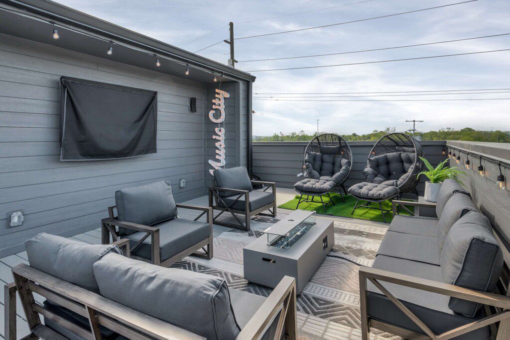 – Rooftop retreat with hot tub, fire pit, egg chairs, and projector wall