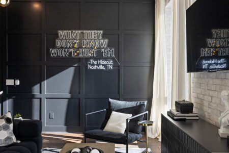 Located in a developing area, The Bootleg and Hideout provides a quiet retreat away from the downtown crowds while still being close enough to easily experience all that Nashville has to offer. While the neighborhood itself is not walkable, rideshares are readily available, making it easy to reach Broadway’s honky-tonks, The Gulch, Germantown, and Music Row in minutes. Whether you’re here for live music, fine dining, or a weekend getaway, this home is the perfect place to unwind in style after exploring the city.