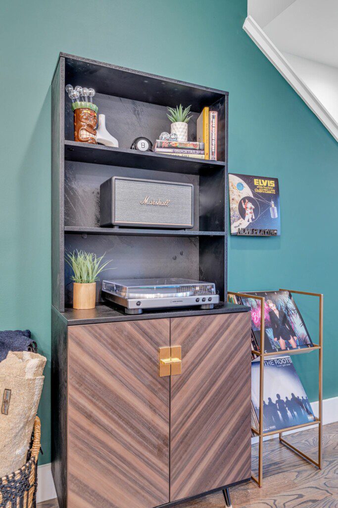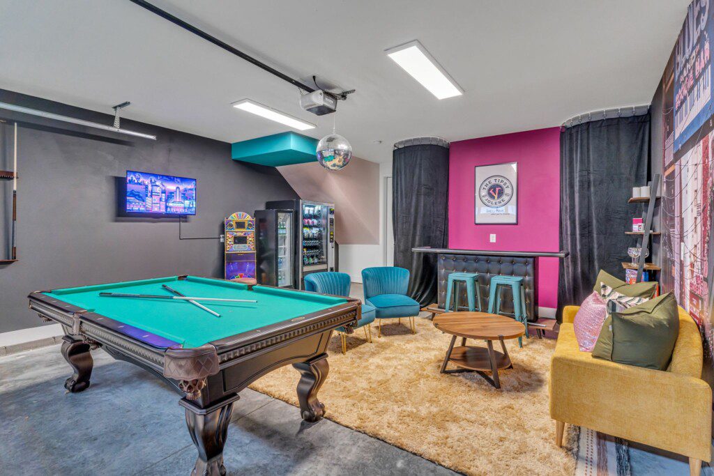 “Tipsy Jolene” Game Room & Bar: Transforming the garage into a delightful game room, enjoy amenities like a flat-screen TV, antique bar, pool table, Wheel of Fortune arcade game, vending machine, and various seating areas.
