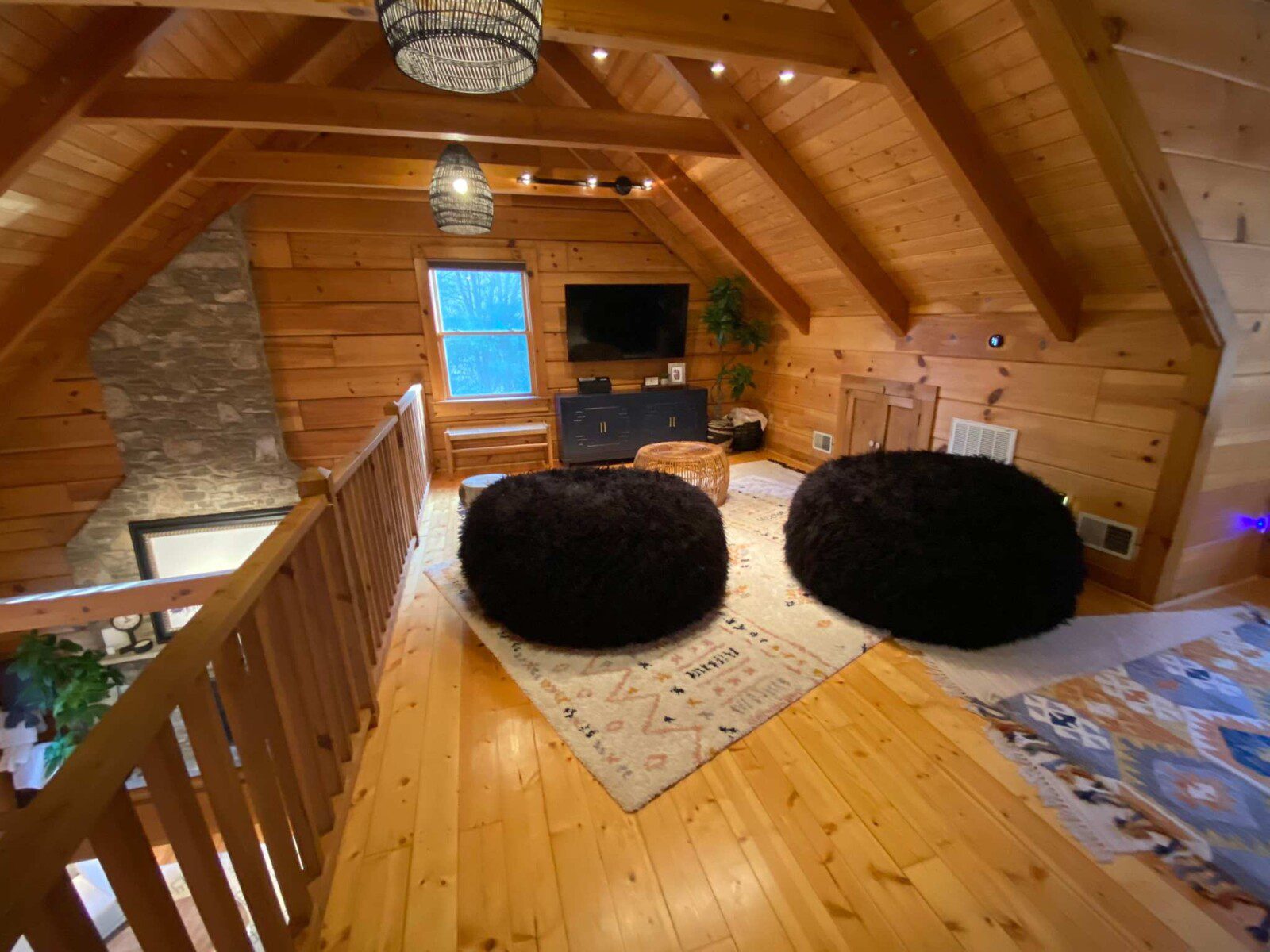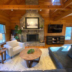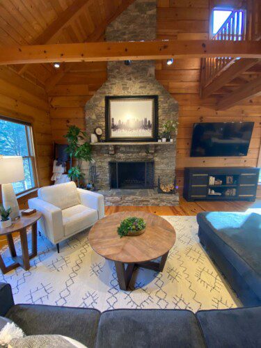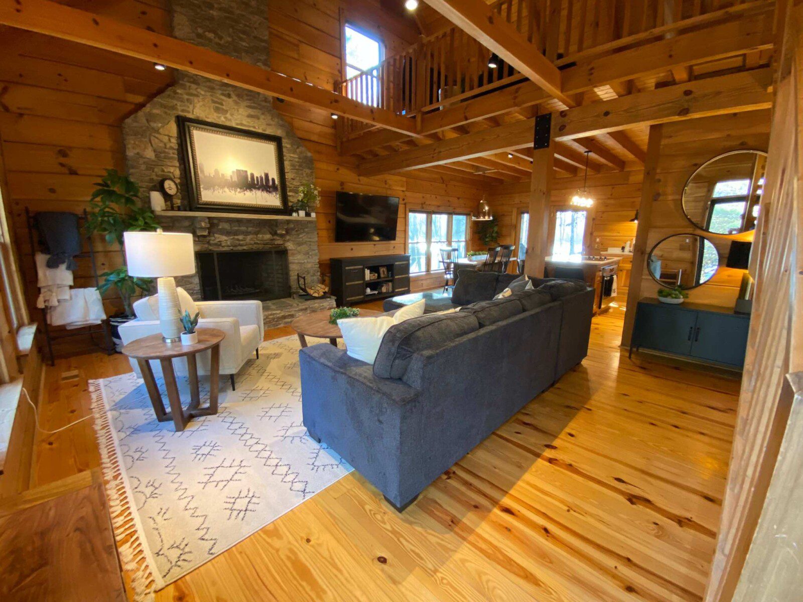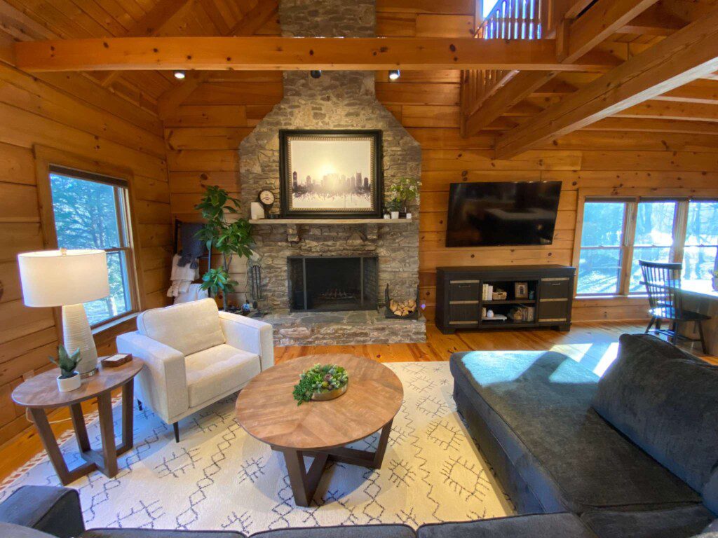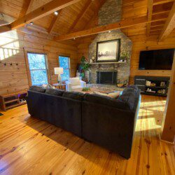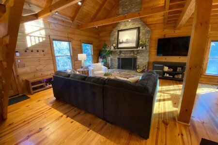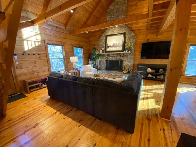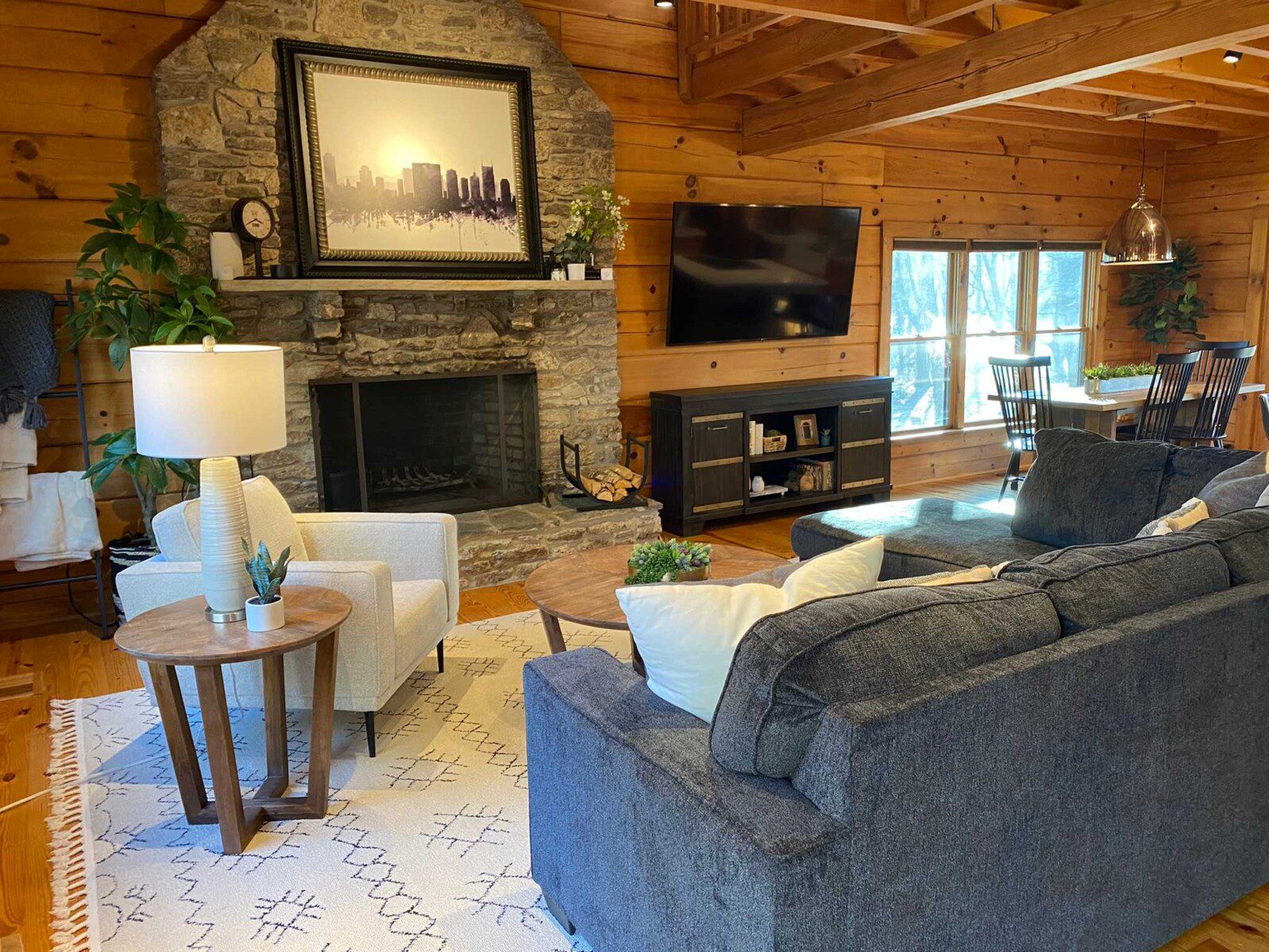 Living Room: A large, inviting living space with a sofa bed, oversized flat-screen TV, and a wood-burning fireplace that sets the perfect cabin mood. Plenty of room to unwind after a day outdoors.