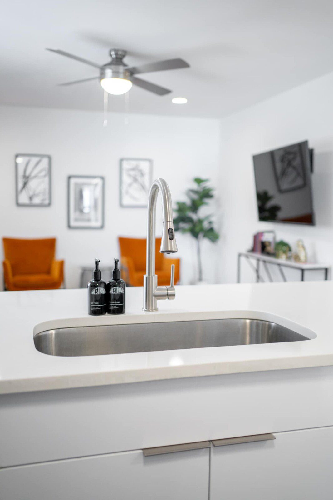 Living Area: 55″ Smart TV, free high-speed Wi-Fi, large sofa, and dining/work seating