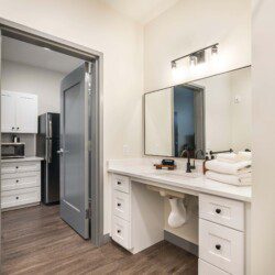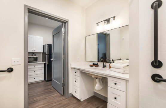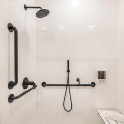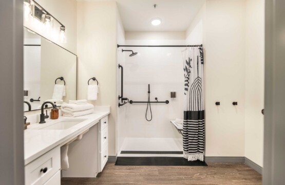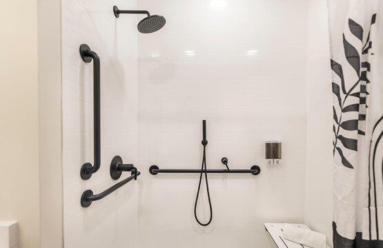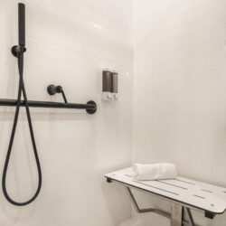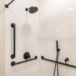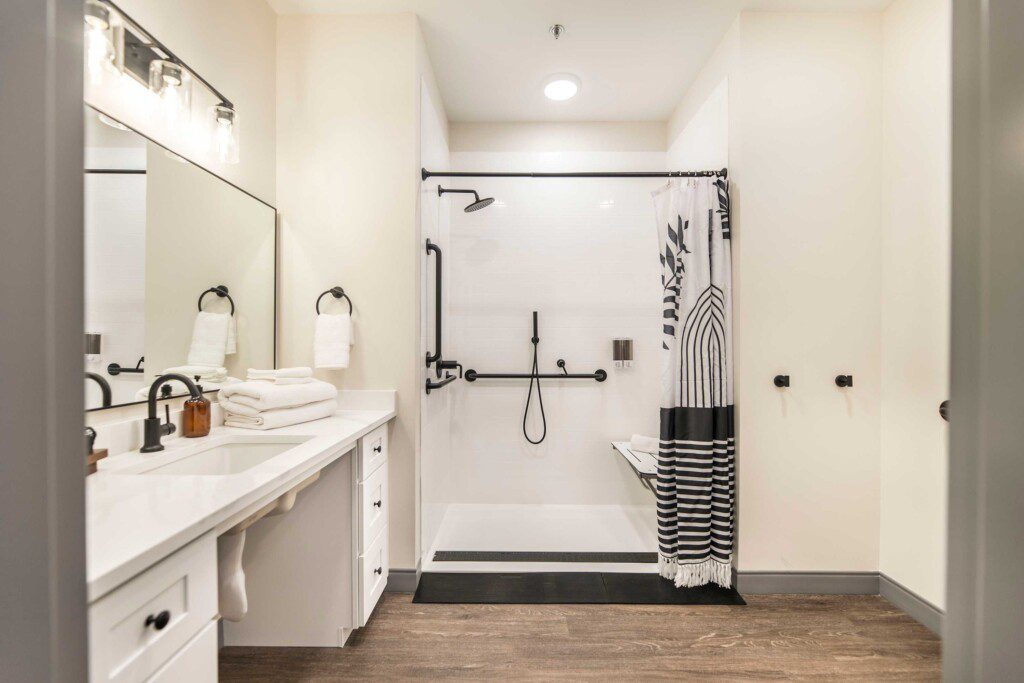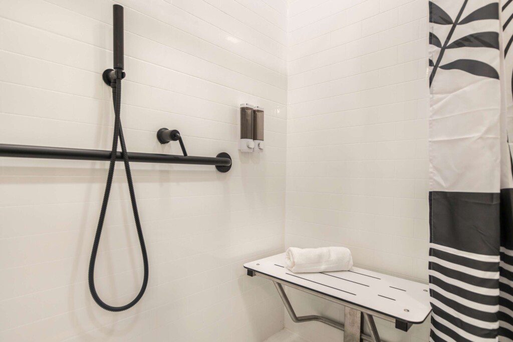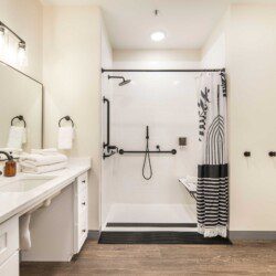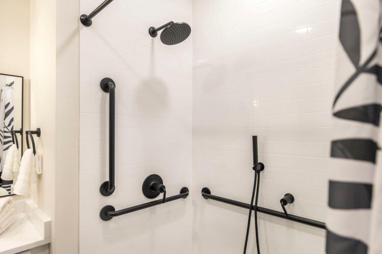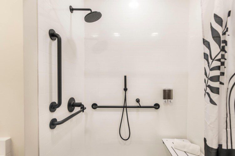 Private bathroom with roll-in shower and grab bars for comfort and safety