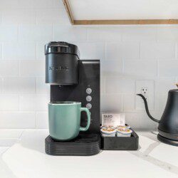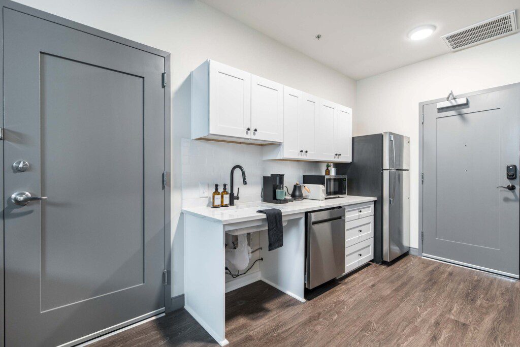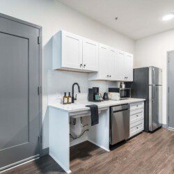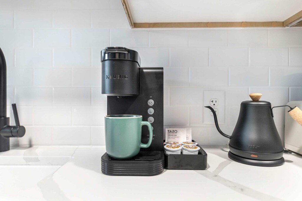Kitchenette with refrigerator, microwave, coffee maker, and basic essentials