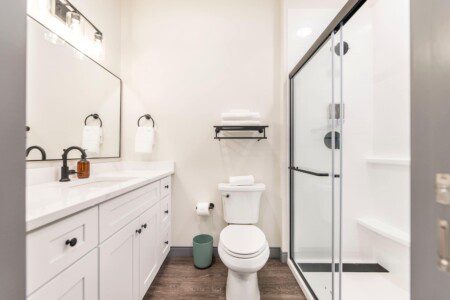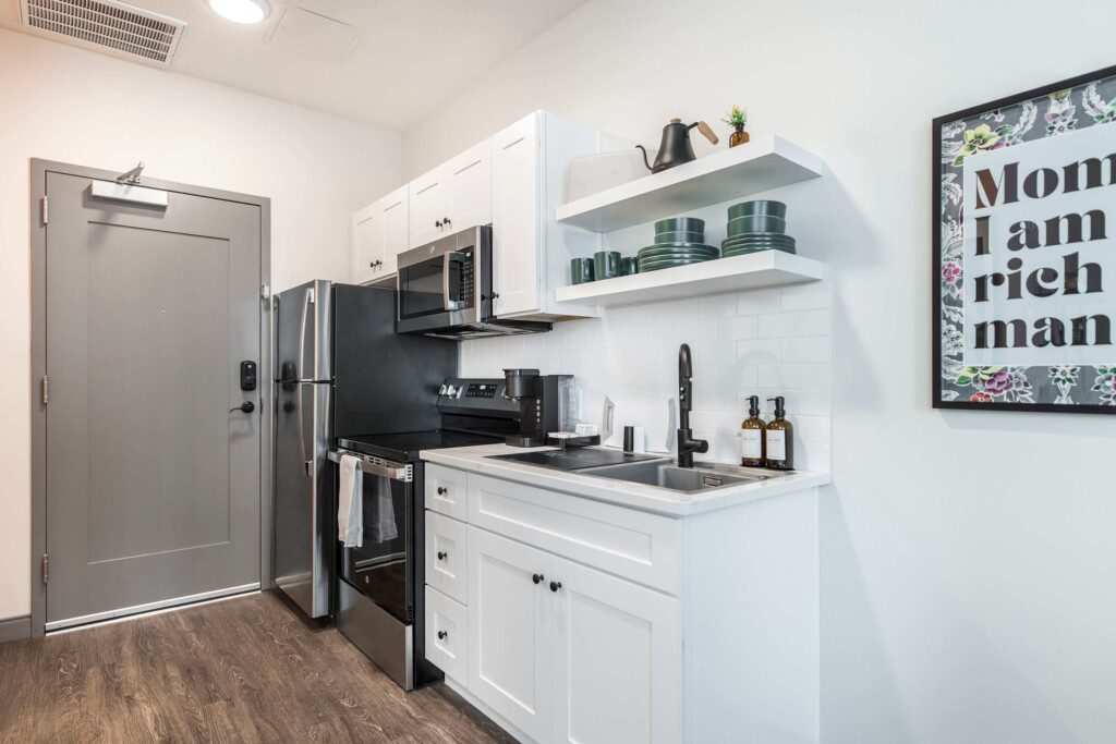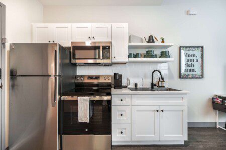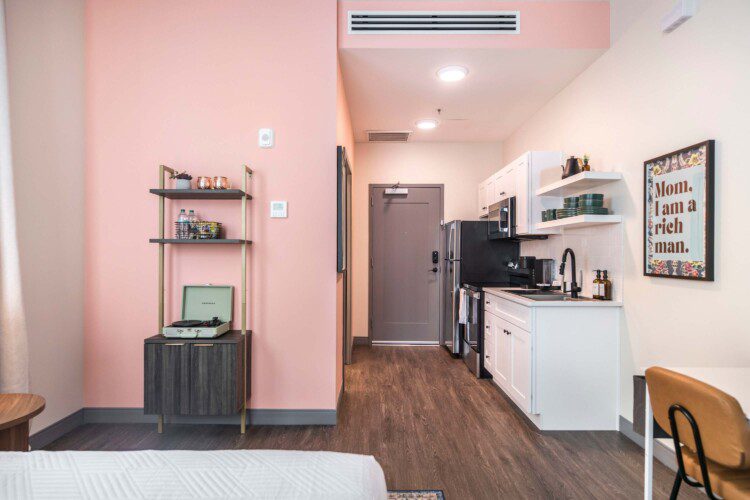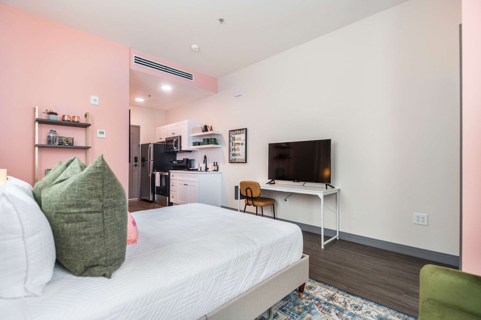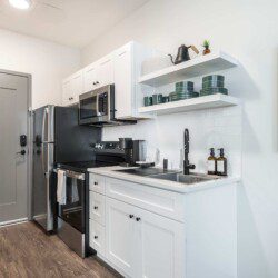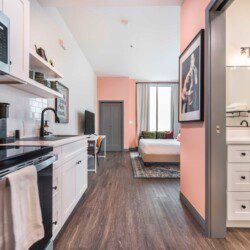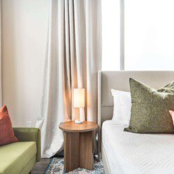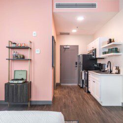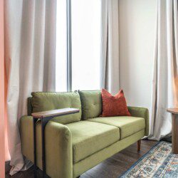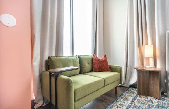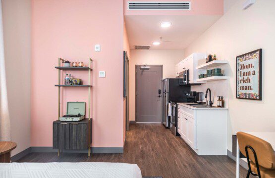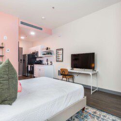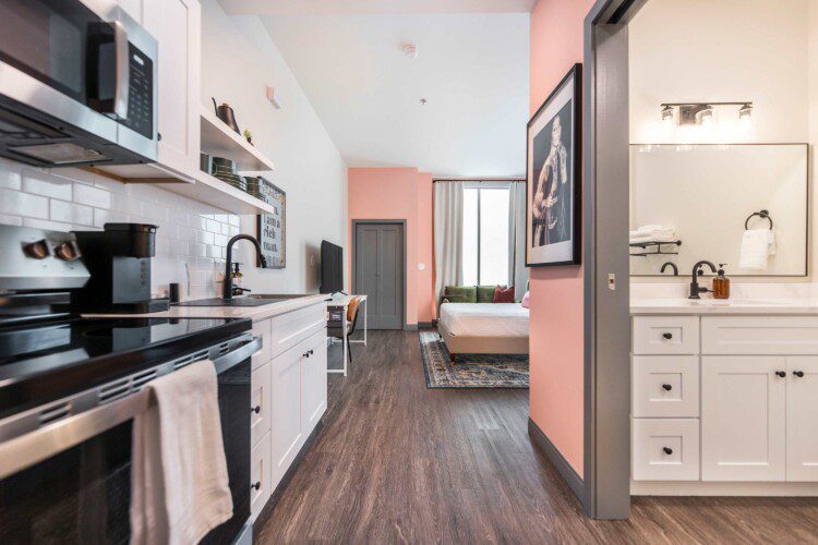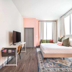 This Cher-inspired studio embraces confident design and vibrant color. Pops of pink bring playful energy to the space, while full-length windows on two walls fill it with light and highlight the corner location. Every detail is designed for a comfortable and memorable stay in the heart of Macon.