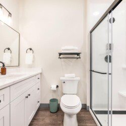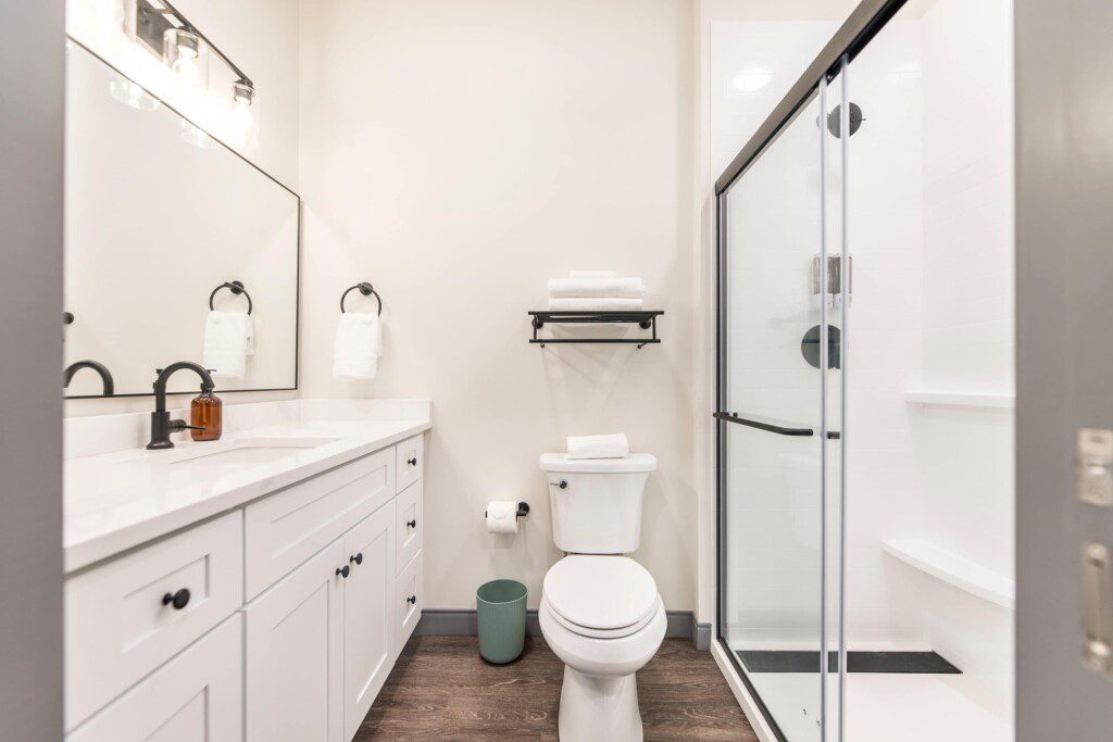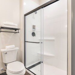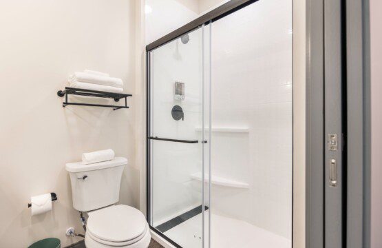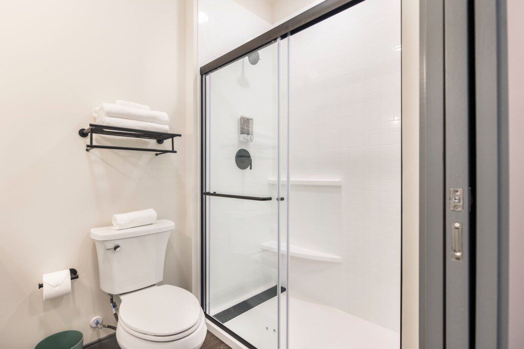 Private bathroom with shower, fresh towels, and toiletries