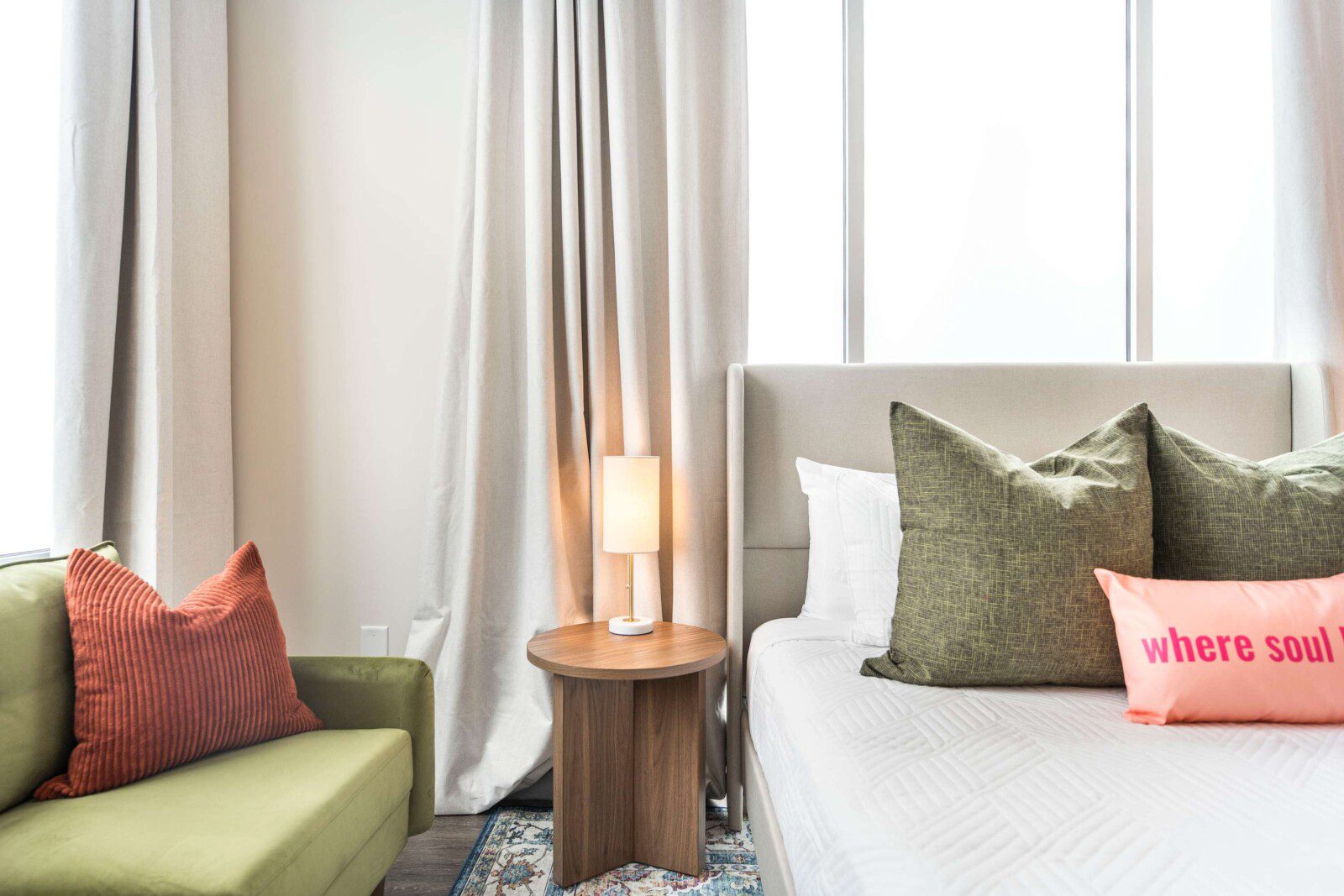 This Cher-inspired studio embraces confident design and vibrant color. Pops of pink bring playful energy to the space, while full-length windows on two walls fill it with light and highlight the corner location. Every detail is designed for a comfortable and memorable stay in the heart of Macon.