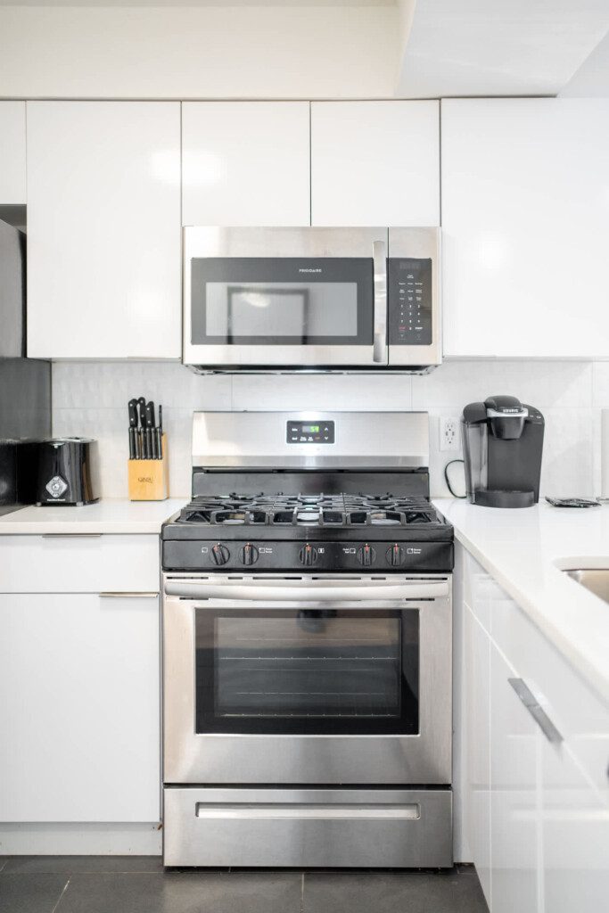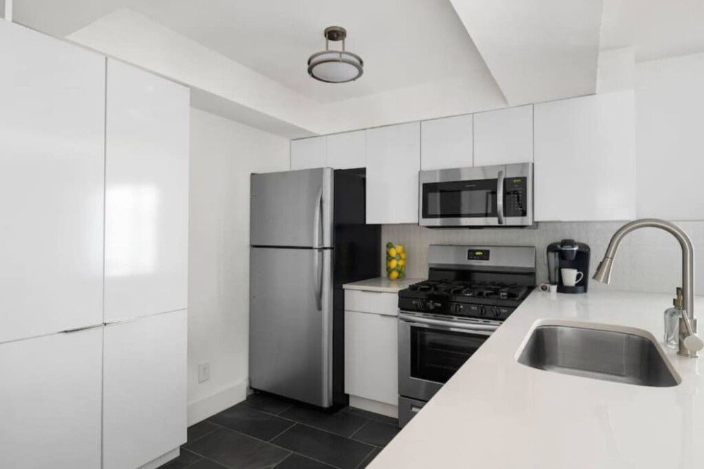 Kitchen: Brand-new stainless steel appliances, quartz countertops, tile backsplash, cookware, and utensils