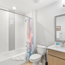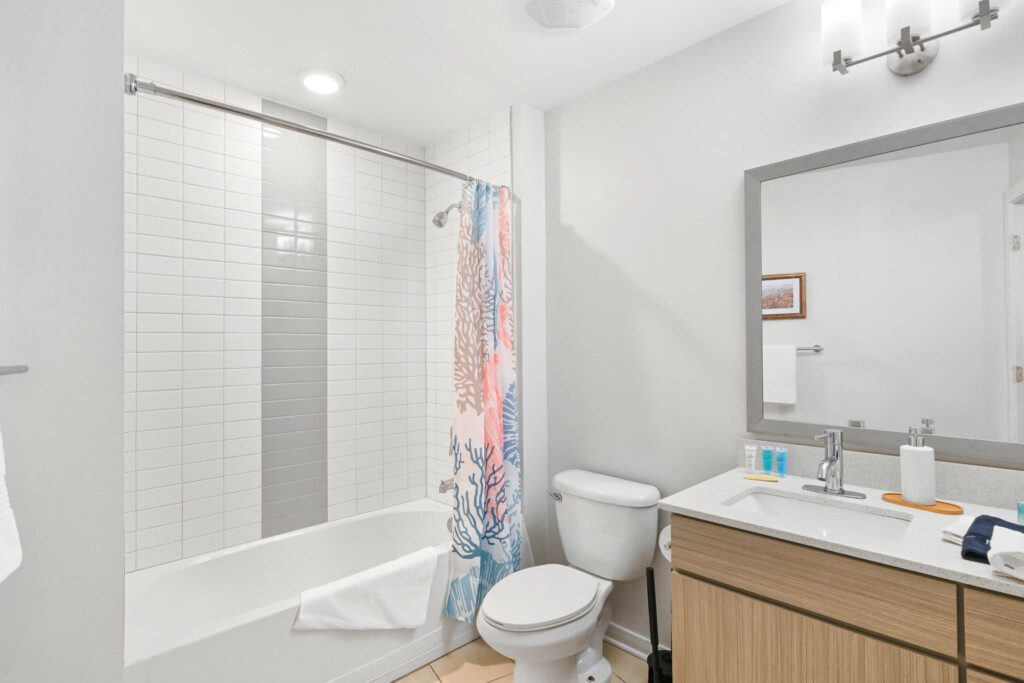 The bathroom includes a tub/shower combination and is stocked with essential items for your stay.